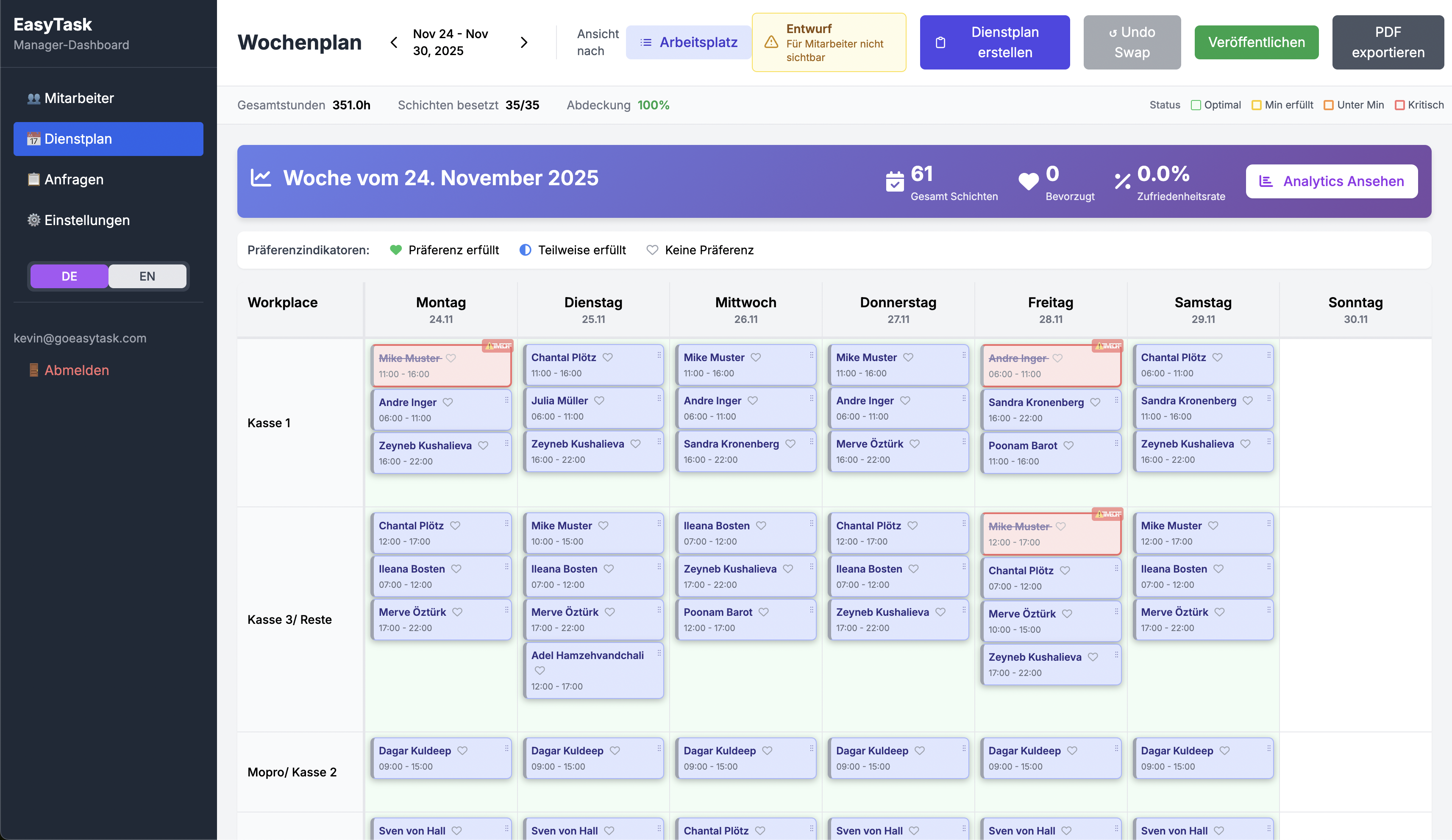 A smart shift scheduling platform that takes the headache out of workforce planning. It handles shift planning, legal constraints, and employee preferences automatically, replacing hours of manual work.